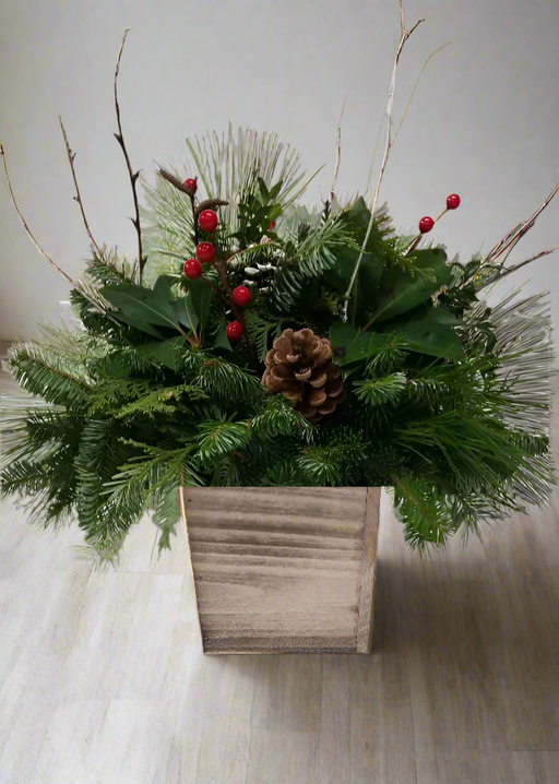 Out of stockA very cute arrangement made in a wooden crate filled with fresh Fraser Fir, White Pine, Boxwood, and Cedar tips. Also has Fresh Winterberry, natur...