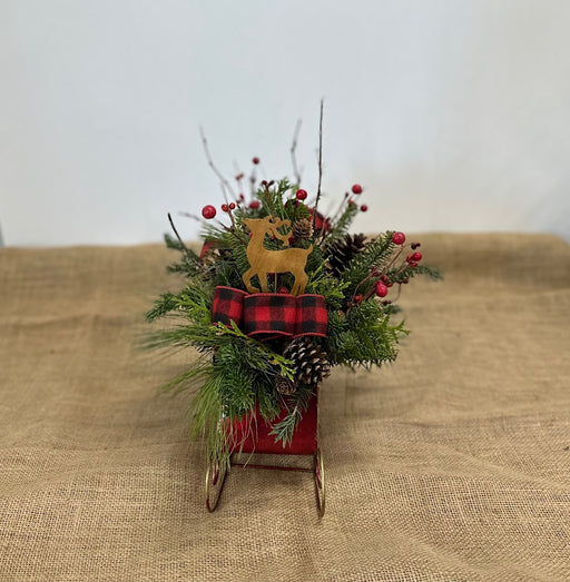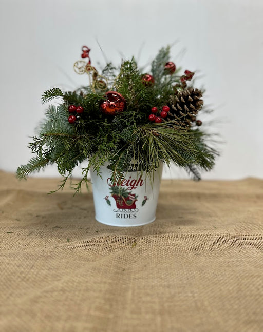 Out of stockThis is a Red and Silver Tin Sleigh filled with fresh cut Fraser Fir, White Pine, Boxwood, and Cedar tips. It comes decorated with several differen...